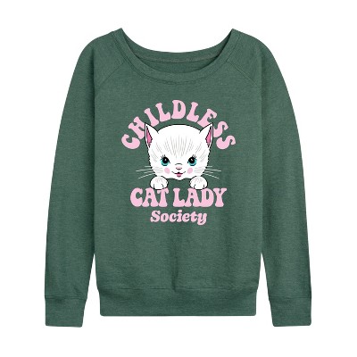 Women's - Instant Message - Childless Cat Lady Society Lightweight French Terry Wide Neck Long Sleeve Graphic Shirt