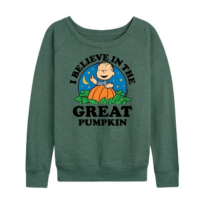Women's - Peanuts - I Believe In The Great Pumpkin Lightweight French Terry Wide Neck Long Sleeve Graphic Shirt
