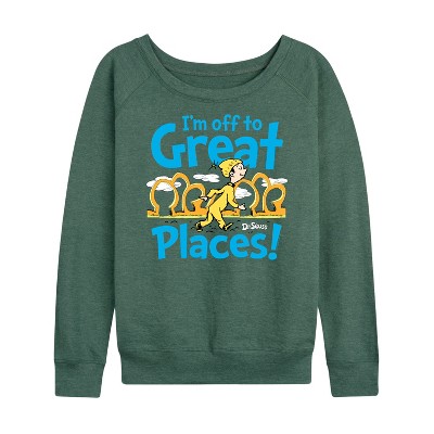 Women's - Dr. Seuss - I'm Off To Great Places Lightweight French Terry Wide Neck Long Sleeve Graphic Shirt