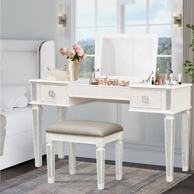 Gulches Mirrored Vanity Desk Set - Drawers, Mirror & Stool, Flip Up Dressing Table, Women/Girl Bedroom Furniture Combo