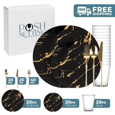 Posh Setting 140 Piece Black And Gold Plastic Party Bundle - Royal (20 Settings)