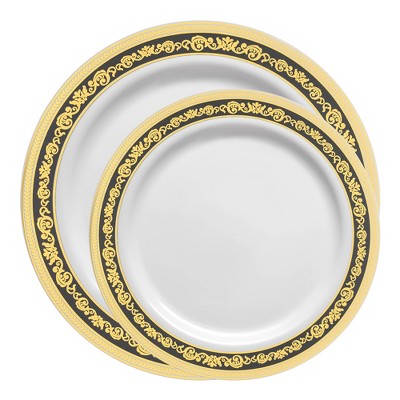 Smarty Had A Party White w/ Black and Gold Royal Rim Plastic Dinnerware Set - 40 Sets
