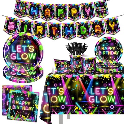 Itopfox 142 Piece Neon Party Supplies Kit Includes 1 Tablecloth 20 Paper Plates 20 Dessert Plates 1 Banner 40 Napkins 20 Pairs Cutlery 20 Cups
