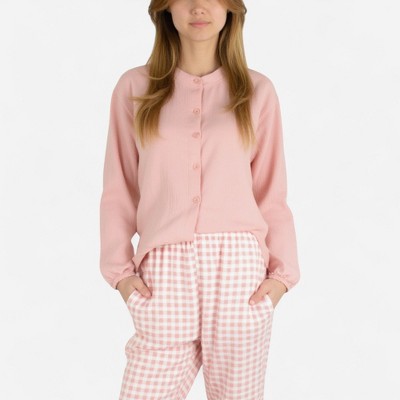 Anna-Kaci Lounge Women's Woven Pajama Set with Long Sleeve Button-Up Top Elastic Cuff Sleeves and Relaxed Gingham Print Lounge Pants