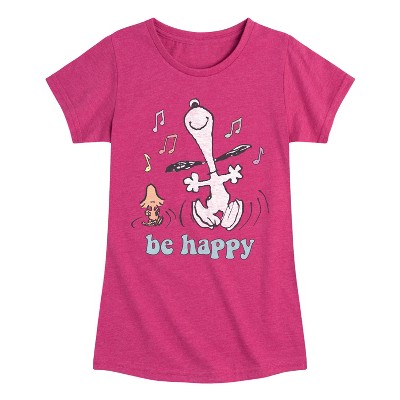 Girls' - Peanuts - Be Happy Snoopy And Woodstock Fitted Short Sleeve Graphic T-Shirt