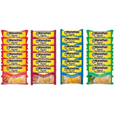 Maruchan Ramen Instant Noodle Soup 24 Packs, 4 Flavors - 6 Pack Beef, 6 Pack Roast Beef, 6 Pack Soy Sauce, 6 Pack Chili