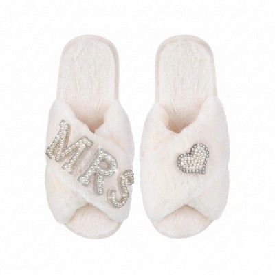 Anna-Kaci Lounge Women’s Plush Crisscross Slide Slippers with Valentine Pearl Letter Embellishment and Cushioned Footbed- 9.5-10, White