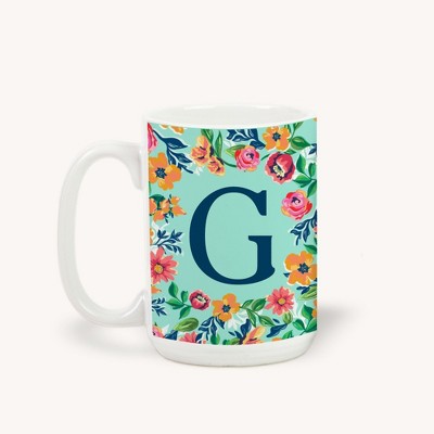 Personalization Mall Flowery Initial Coffee Mug, 15 Oz., Blue Aqua