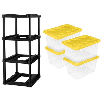 Sterilite 4 Tier Tote Rack Organizer with 4 Pack 27 Gal Industrial Storage Totes