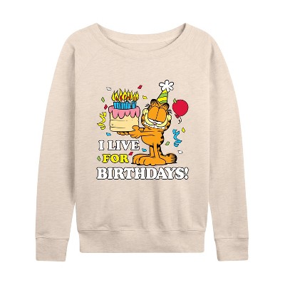 Women's - Garfield - I Live For Birthday's Lightweight French Terry Wide Neck Long Sleeve Graphic Shirt