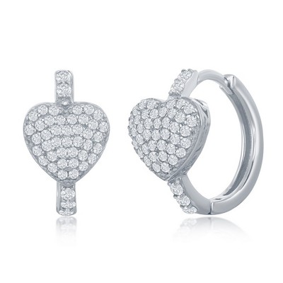 Bella Silver Sterling Silver Mircro Pave CZ Heart Huggie Hoop Earrings - Silver