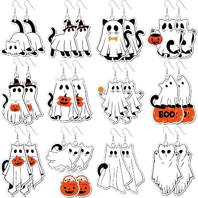12 Pairs Wooden Halloween Earrings for Women - Ghost Cat Dangle Pendants, Cute Wood Jewelry Gift Set