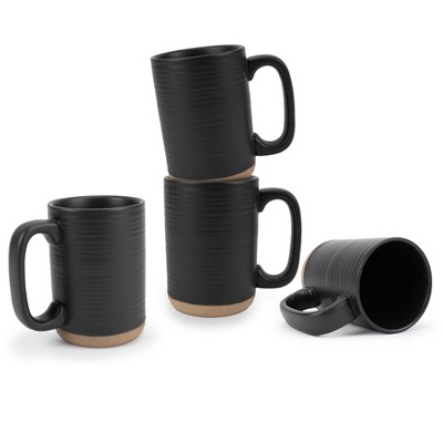 Elanze Designs Tall Ribbed Raw Clay Bottom Black 16 ounce Ceramic Coffee Mugs Set of 4