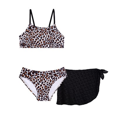 Aqua Green Girls 3-Piece Bikini Set with Crochet Sarong Coverup