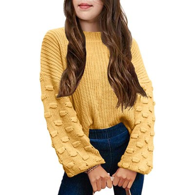 Girls Pullover Sweater Cable Knit Soft Comfy Sweater for Girls Crew Neck Sweater Puff Sleeve Ribbed Knit Cuff,Yellow - 150