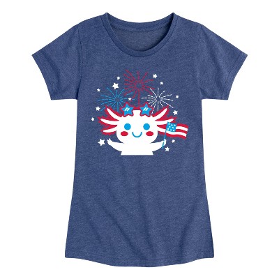 Girls' - Instant Message - Axolotl Red White and Blue Fireworks with Flag Fitted Short Sleeve Graphic T-Shirt