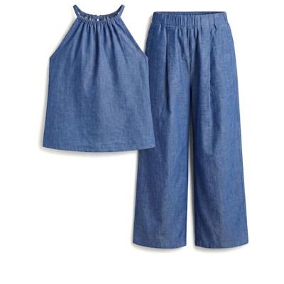 INSPIRE CHIC Girls' 2 Pcs Summer Outfits Cami Ruffle Halter Neck Sleeveless Top with Wide Leg Pant Sets