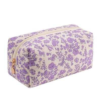 Narwey Cute Floral Makeup Bag Small Cotton Quilted Cosmetic Bag, Aesthetic Essential Bag Emergency Bag Gift (Purple Flowers)