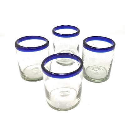 Dos Sueños Mexican Hand Blown Tumblers - Blue Rim - 10oz - Set of 4