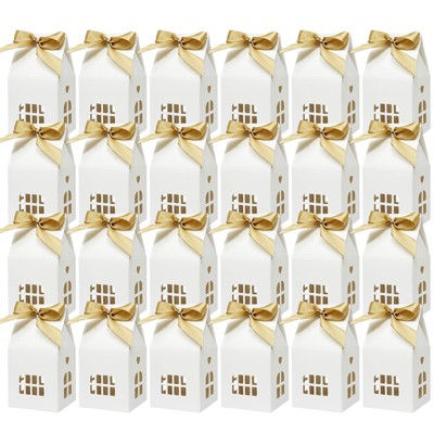 Wrapables Christmas House Shaped Gift Boxes with Ribbons for Weddings, Housewarming, Cookies, Candies, Treats, Party Favors (Set of 24), White