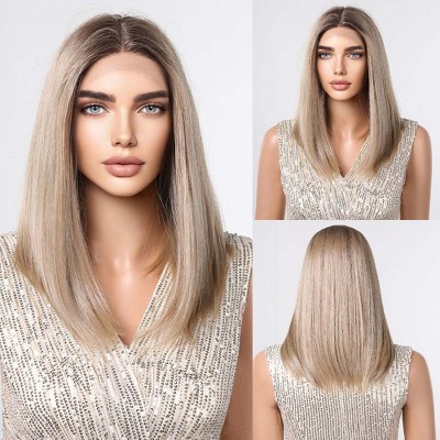 Jessie's Wig 26 Inch Wavy Hair With Curtain Bangs Synthetic Hair Ombre Ash Blonde With Dark Brown Color 1 Pc/Pack