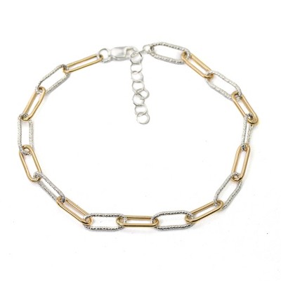 Bella Silver Sterling Silver Alternating Paperclip Design & CZ Bracelet - Gold Plated - Gold - 7+1 Inch