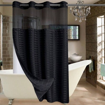 No Hook Shower Curtain with Snap in Liner Set Black Waffle Bathroom 75 inch Lx 72 inch