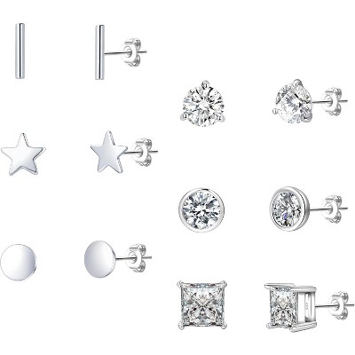 925 Sterling Silver CZ Stud Earrings: Round & Square Designs, 4/5/6-Piece Hypoallergenic Set