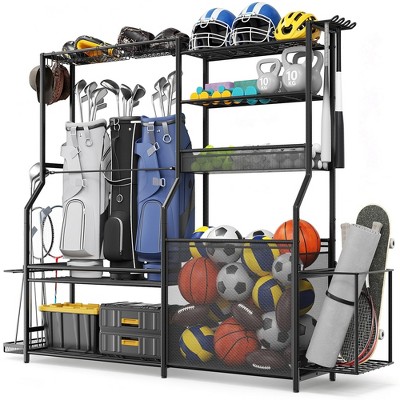 MOEPISY Garage Sports Equipment Organizer, 3 Golf Bag Organizer Stand Heavy-Duty Ball Storage Rack with Basket and Hooks