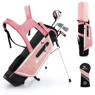 Gymax Junior Golf Club Set for Kids Ages 8-10 w/ Stand Bag Rain Hood #1 Driver #7 & #s Irons and Putter Pink/Green