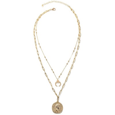 Slickblue Layered Chain Necklace, Coin Pendant With Horn Charm, Boho Festival Jewelry, Gold, 16"+3"