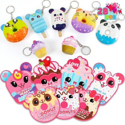 Joyfy 28 Packs Valentine Dessert squishy toys Stress Relief Keychains with Cards for Classroom Exchange Prizes, Exchange Gifts