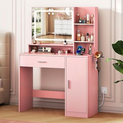 DEXYLLO Small Vanity Desk with Lighted Mirror and Lights for Girls, Makeup Vanity Table with Drawer, Cabinet and Open Shelves