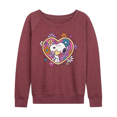 Women's - Peanuts - Hug Heart Flower Lightweight French Terry Wide Neck Long Sleeve Graphic Shirt