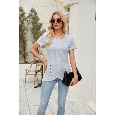 Women's Short Sleeve Crewneck T Shirt Asymmetrical Hem Button Detail Casual Summer Top
