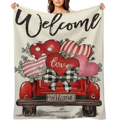 Valentine's Day Fleece Blanket Ultra Soft Anti-Pilling Red Truck Heart Welcome Print for Couch Bed Camping