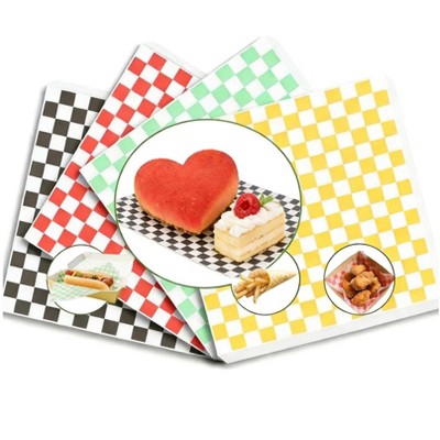 Aoibox 100Pcs Deli Paper Sheets 7x7 Inch 4 Color Checkered Wax Paper Grease Resistant Food Basket Liners for Sandwiches Snacks Parties