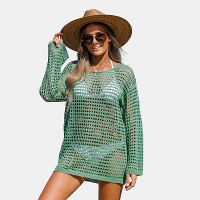 Clearlove Cover Ups for Plus Size Women Round Neck Pointelle Knitted Cover Ups Drop Shoulder Crochet Knit Caftan Cover up for Curvy Women