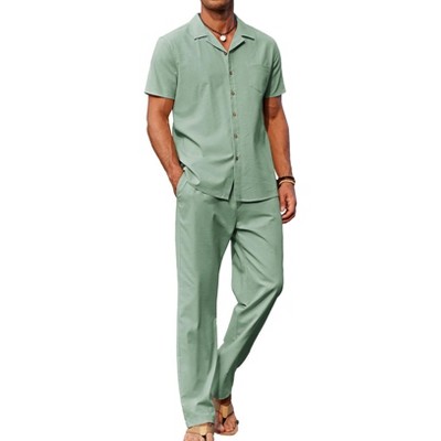 COOFANDY Men 2 Piece Linen Outfit Beach Button Down Shirt Casual Loose Pant Sets