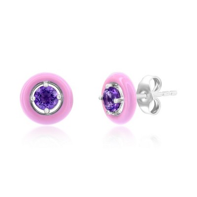 Simona Sterling Silver Enamel & Gemstone Halo Studs - Garnet - Available Colors: Red,