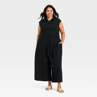 Allegra K Women's Button Down Collared Wide Leg Tie-Waist Sleeveless Cargo Jumpsuits