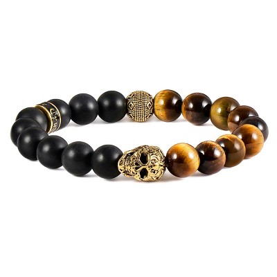 Crucible Men's Skull with Tiger Eye and Matte Onyx Stone Beads Stretch Bracelet