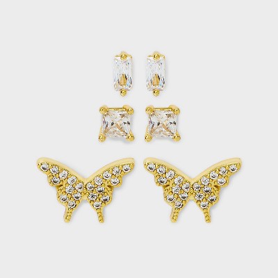 Rectangle and Square Butterfly Stud Earring Set 3pc - A New Day™ Gold: Brass, Sterling Silver, Cubic Zirconia