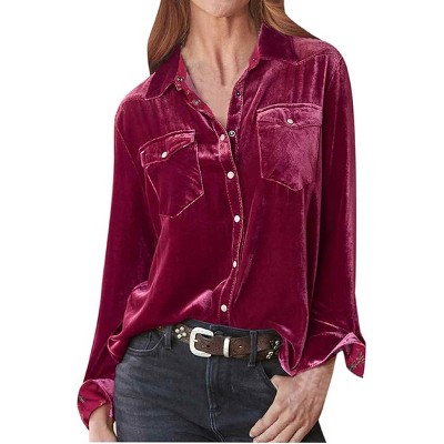 Women Casual V Neck T Shirt Velvet Long Sleeve Button Down Blouses Solid Color Slim Lapel Collar Tunic Tops Tees