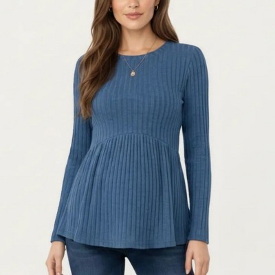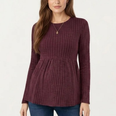 Anna-Kaci Women's Maternity Long Sleeve Ribbed Knit Top with Crew Neck and Empire Waist