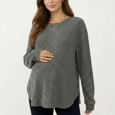 Anna-Kaci Women's Maternity Long Sleeve Ribbed Knit Top with Crew Neck Side Button Detail
