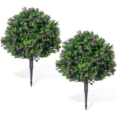 2 Pack Artificial Lavender Topiary Ball Tree with Ground Spike, 23.6'' UV Resistant Fake Shrubs Bushes, Faux Evergreen Plant with Flowers for Garden