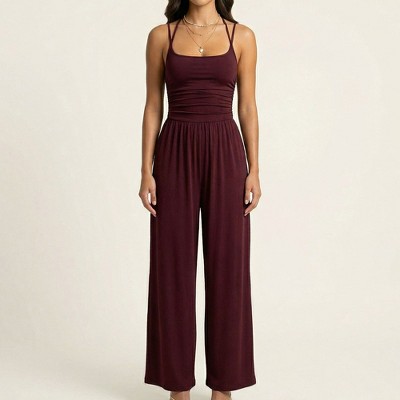 Anna-Kaci Women's Sleeveless Wide Leg Jumpsuit with Scoop Neck Ruched Bodice Soft Stretch Fabric Lightweight Flowy Fit