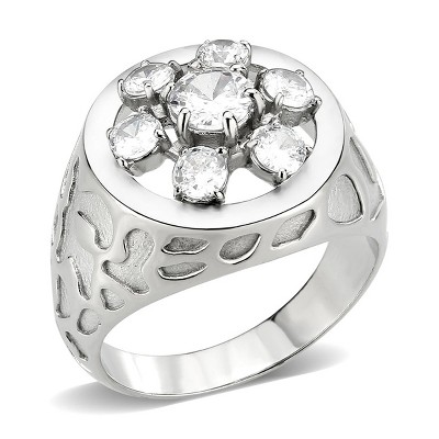 Slickblue Men’s Polished Stainless Steel Ring with Clear Synthetic CZ, Round Center Stone, Rosette Design, Size 8-13