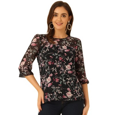 INSPIRE CHIC Women's Round Neck Ruffle 3/4 Sleeve Floral Print Chiffon Top